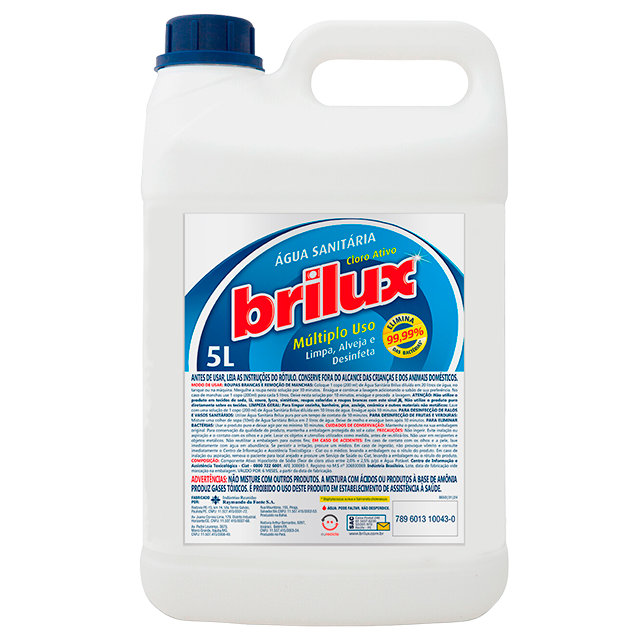 Modo de Uso : Roupas brancas e remoção de manchas: coloque 1 copo (200ml) de água sanitária Brilux diluída em 20 litros de água, no tanque ou na máquina. Mergulhe a roupa nesta solução por 30 minutos. Enxágue e continue a lavagem adicionando o sabão de sua preferência. No caso de manchas use 1 copo (200ml) para cada 5 litros. Deixe nesta solução por 10 minutos, enxágue e proceda a lavagem. Limpeza geral: para limpar cozinha, banheiro, piso, azulejo, cerâmica e outros materiais não metálicos: lave com uma solução de 1 copo (200ml) de água sanitária Brilux diluída em 10 litros de água. Enxágue após 10 minutos. Para desinfecção de ralos e vasos sanitários: utilize água sanitária Brilux pura por um tempo de contato de 10 minutos. Para combate ao Covid-19 nas superfícies do ambiente doméstico não porosas (piso, pias, vasos sanitários): utilize uma solução de 50ml (01 copo descartável de 50ml cheio) de água sanitária Brilux diluída em 950ml de água e deixar agir por um tempo de contato de no mínimo 10 minutos. Para desinfecção de frutas e verduras: misture uma colher de sopa (10ml) de água sanitária Brilux em 2 litros de água. Deixe de molho e enxágue bem após 10 minutos. Para eliminar bactérias: usar o produto puro e deixar agir por no mínimo 10 minutos.